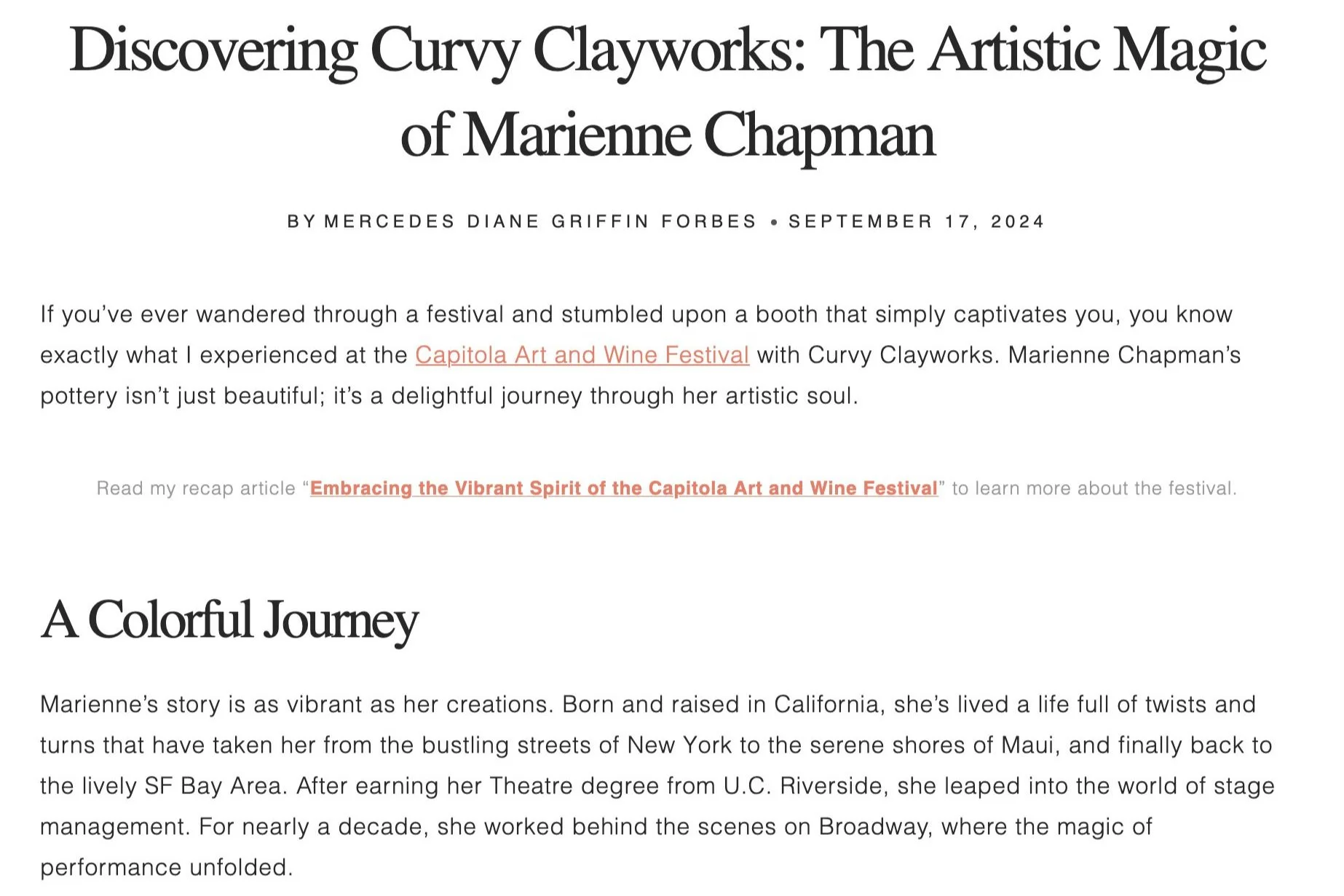 Mercedes Diane Griffin wrote a lovely article about me after we met at the Capitola Art & Wine Festival. She is an amazing person who is “championing women, reimagining food systems, and sparking sustainable change—because meaningful impact starts with bold action.”